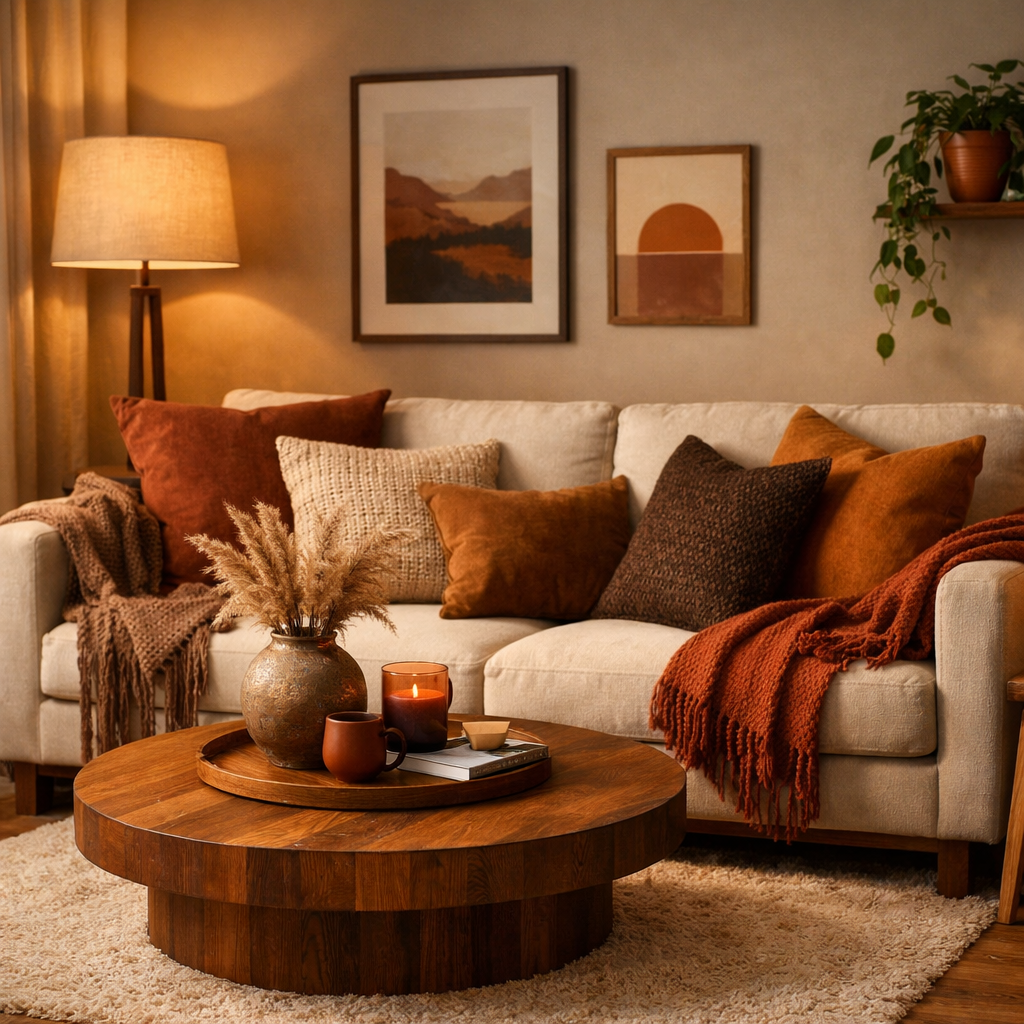 Layer soft textures, warm lighting, and natural materials to transform your living room into a comfortable and inviting retreat. Thoughtfully styled elements like cozy throw blankets, plush pillows, wooden accents, and soft ambient lighting create a relaxing atmosphere that feels warm, welcoming, and effortlessly stylish perfect for everyday living and unwinding at home.